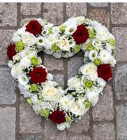 Photo non contractuelle | 🌸Cœur Fleuri « Harmonie Éternelle » Ce cœur floral, aux teintes rouge, blanc et vert, symbolise l'amour éternel et le respect. Composé de roses rouges, blanches, de chrysanthèmes et de verdure, il exprime l'amour indestructible et la sérénité.