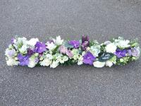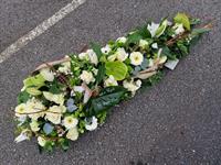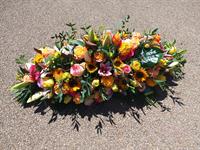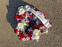 | Raquette - Avec ruban Composition florale aux couleurs variables selon les saisons, avec possibilité de ruban personnalisé.