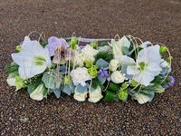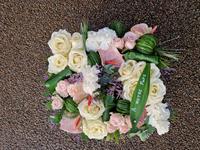 | Coussin Carré - Avec ruban Composition florale aux couleurs variables selon les saisons, avec possibilité de ruban personnalisé.