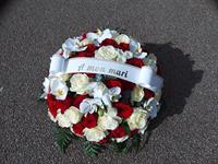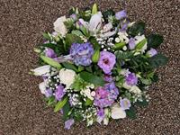 | Coussin Rond - Avec ruban Composition florale aux couleurs variables selon les saisons, avec possibilité de ruban personnalisé.