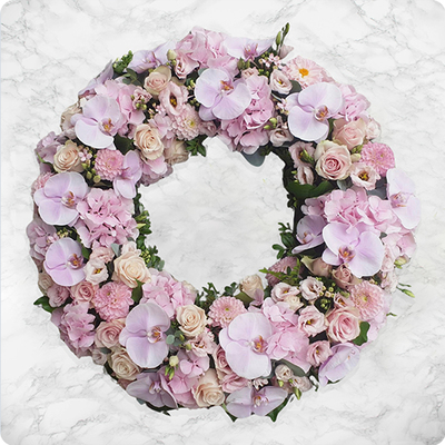 Délicate raquette de fleurs de saison pastel - Env. 70 / 75 cm - Ruban inclus avec 50 caractères max -