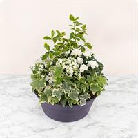 Composition verte et blanche avec 4 - 5 plantes et fleurs de saison - Diamètre env. 30 cm - Convient pour les cimetières