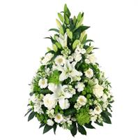Coussin conique de fleurs de saison dans les tons de blanc et de vert - D 50 x H 60 cm env. - Ruban inclus avec 50 caractères max -