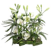 Raquette de fleurs de saison dans les tons blancs et agrémentée d'un généreux feuillage - Env. 70 / 75 cm - Ruban inclus avec 50 caractères max -