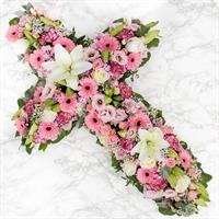 Eclatante croix à base de fleurs de saison colorées sur base de fleillage - Env. 75 x 50 cm - Ruban inclus avec 50 caractères max -