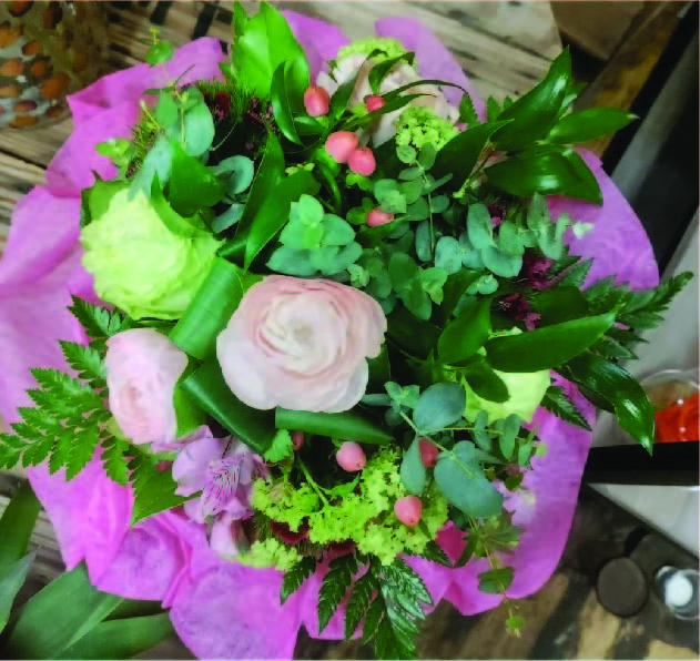 • Feuillage travaillé : Feuilles d’aspidistra et verdure pour structurer la gerbe.