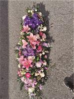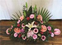 Photo non contractuelle | 🌸Devant de Cercueil « Le Papillon » Cette composition florale aux tons roses et violets, avec des lys blancs et des anthuriums roses, symbolise respect et sérénité, idéale pour un dernier adieu apaisant.