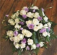 Photo non contractuelle | 🌸Coussin Rond « Harmonie de Roses » Le coussin « Harmonie de Roses » associe roses blanches et lisianthus violets, symbolisant l’amour éternel et le souvenir lumineux, pour un hommage apaisant et serein.
