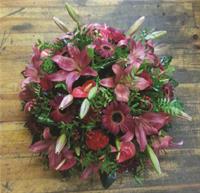 Photo non contractuelle | 🌸Coussin Rond « Harmonie Pourpre » Le coussin « Harmonie Pourpre » mêle lys violets, roses rouges et germinis pourpres, symbolisant dignité et amour éternel.
