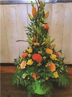 Photo non contractuelle | 🌿Coussin Conique « Soleil d’Automne » Le coussin conique « Soleil d’Automne » est une composition en hauteur aux tons orangés et jaunes, idéale pour un hommage élégant et lumineux lors d’une cérémonie funéraire.