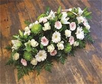 Photo non contractuelle | 🌿Raquette Funéraire « Sérénité Blanche » La raquette « Sérénité Blanche » en fleurs blanches, roses pastel et vert tendre incarne pureté et hommage sincère, idéale pour un dernier adieu.
