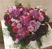 Photo non contractuelle | 🌸Cœur 3D « Émotion Pourpre » Le cœur 3D « Émotion Pourpre », composé de roses rouges, violettes, et d’orchidées Vanda pourpres, symbolise la passion éternelle et le souvenir, parfait pour un hommage solennel.