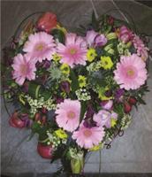 Photo non contractuelle | 🌸Cœur à Plat « Tendresse Pastel » Le cœur « Tendresse Pastel » est une composition délicate avec des germinis roses, des fleurs jaunes et de la verdure, symbolisant un amour sincère et un hommage tendre..