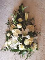 Photo non contractuelle | 🌿Gerbe Piquée « Lumière Éternelle » La gerbe « Lumière Éternelle » associe lys, roses et anthuriums blancs pour un hommage digne et lumineux.