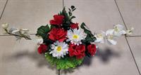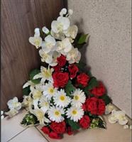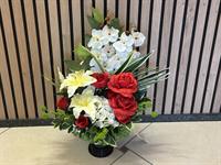 Photo non contractuelle | Gerbe en pot en fleurs de soie blanche et rouge (convient pour vase en granit) Pot composé de fleurs de soie avec une carte - Couleurs peuvent varier (photo non contractuelle - livraison dans les 24 heures).
