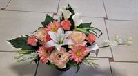Photo non contractuelle | Gerbe en pot en fleurs de soie saumon Pot composé de fleurs de soie avec une carte - Couleurs peuvent varier (photo non contractuelle - livraison dans les 24 heures).