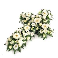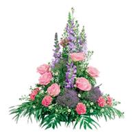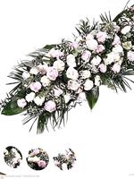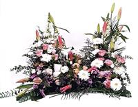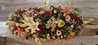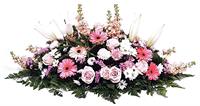 Ce devant de tombe long se compose de roses, mufliers, lisianthus, gerberas, alstroémérias et statices ou autres couleurs ou autres couleurs. ( Fleurs de saison )