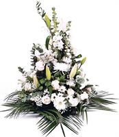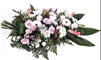 Ce dessus de cercueil se compose principalement de roses, il est agrémenté de gypsophiles et aspidistras ou autres couleurs. ( Fleurs de saison )