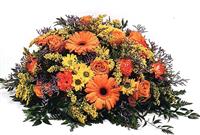 Piqué sur un contenant adapté, ce coussin dans les tons jaunes et orange se compose de gerberas, oeillets, limonimus, solidagos et roses ou autres couleurs. ( Fleurs de saison )