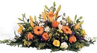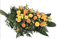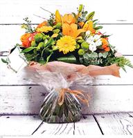 Cette composition dans les tons orangés se compose de lys, roses, oeillets, giroflées, lisianthus et solidagos ou autres couleurs. ( Fleurs de saison )