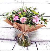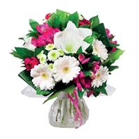 Composition dans les tons de roses se compose de lys, gerberas, roses, giroflées et statices ou autres couleurs. ( Fleurs de saison )