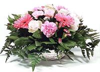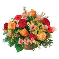 Panier fleuri composé de roses, gerberas, oeillets et alstroémérias accompagnés de feuillage et de son panier ou autres couleurs. ( Fleurs de saison )